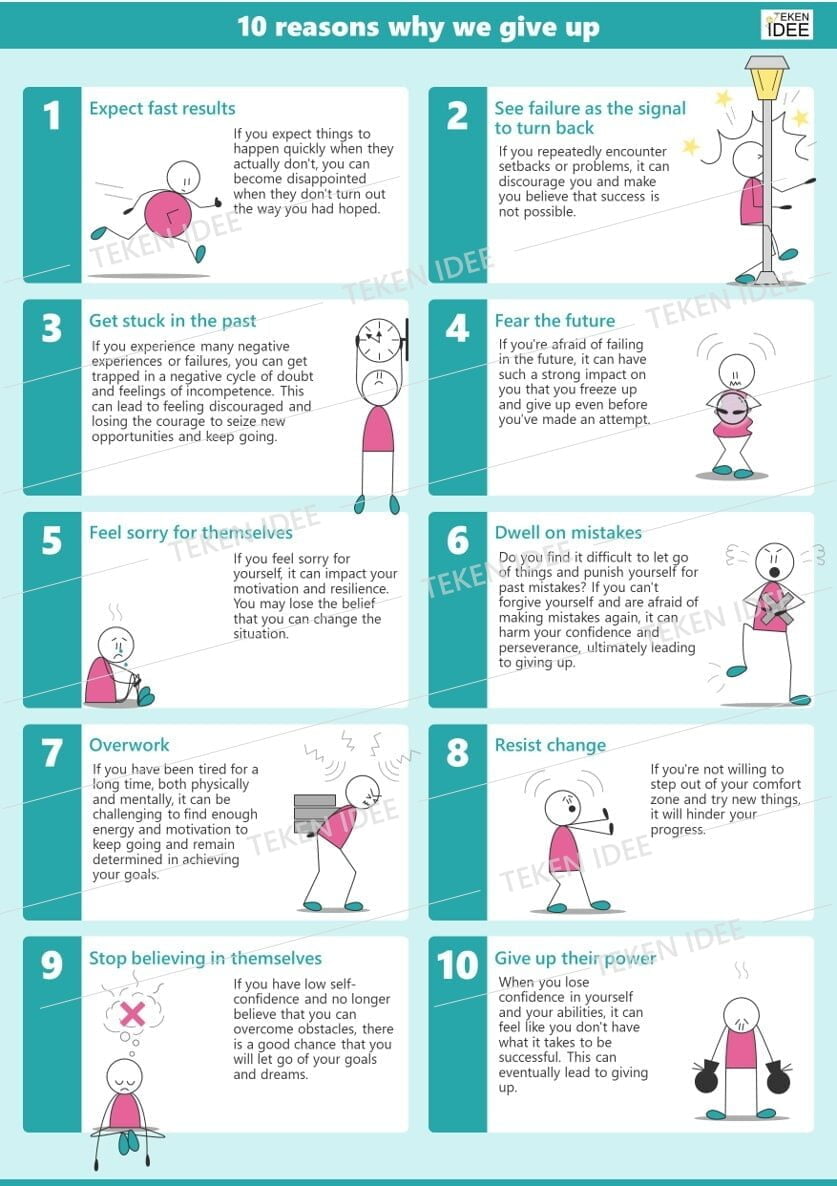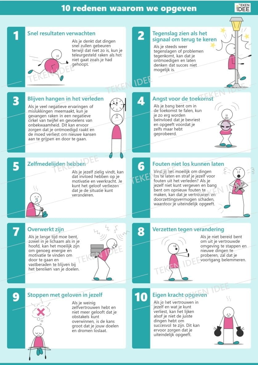 Ontdek in deze infographic de “10 redenen waarom we opgeven”. Verken de verschillende factoren die van invloed kunnen zijn op ons doorzettingsvermogen en begrijp waarom mensen soms de handdoek in de ring gooien. Deze visual biedt inzichten in de veelvoorkomende redenen achter opgeven en moedigt aan tot een grotere veerkracht en volharding in het bereiken van onze doelen.